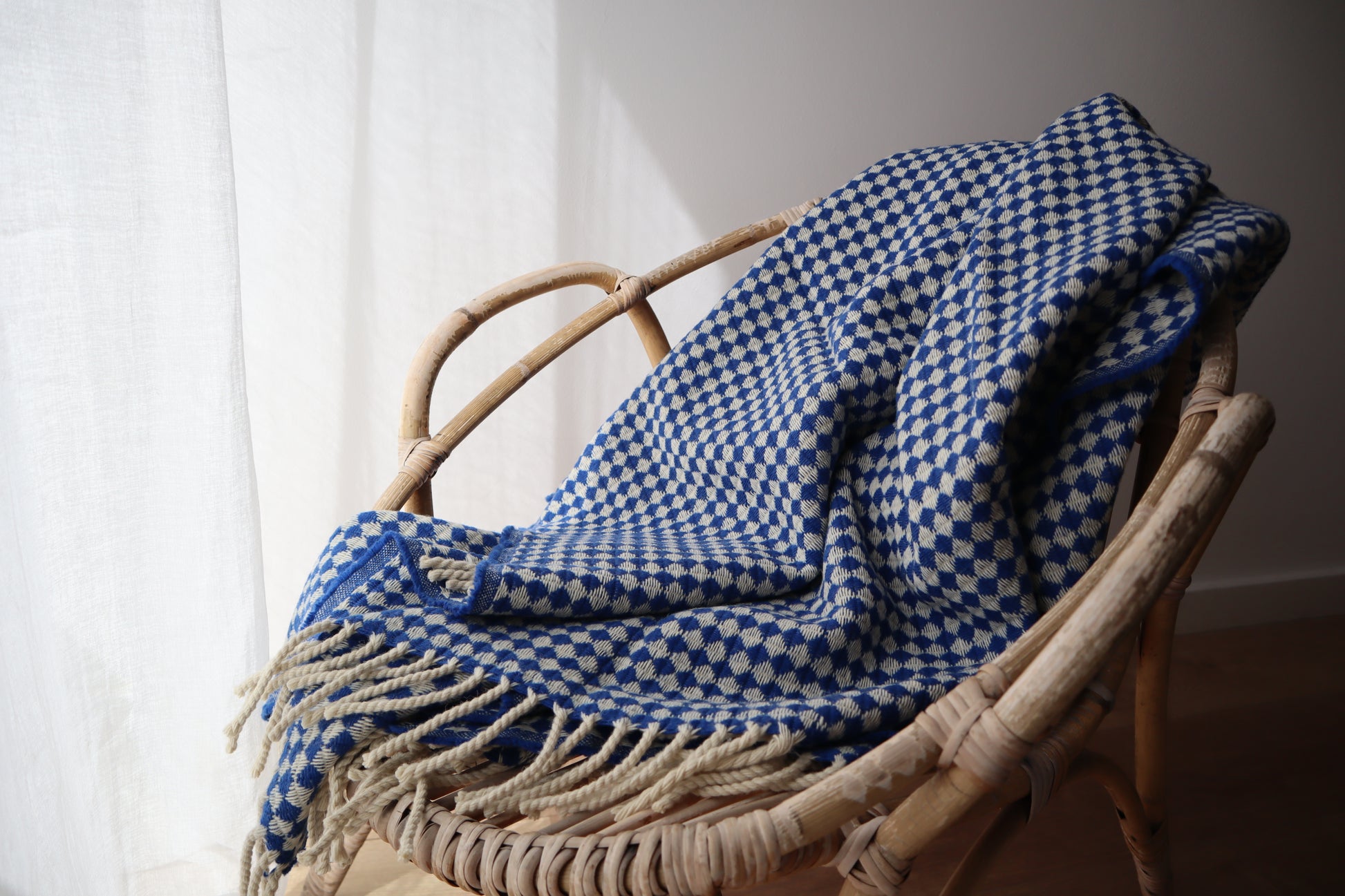 This wool blanket features an elegant check pattern. The diamond design, combined with a detailed, textured weave, creates an appealing visual depth. The soft, high-quality wool provides pleasant warmth and gives the blanket a cozy feel. Classic hand-tied fringes at the ends complete the design with an elegant touch.