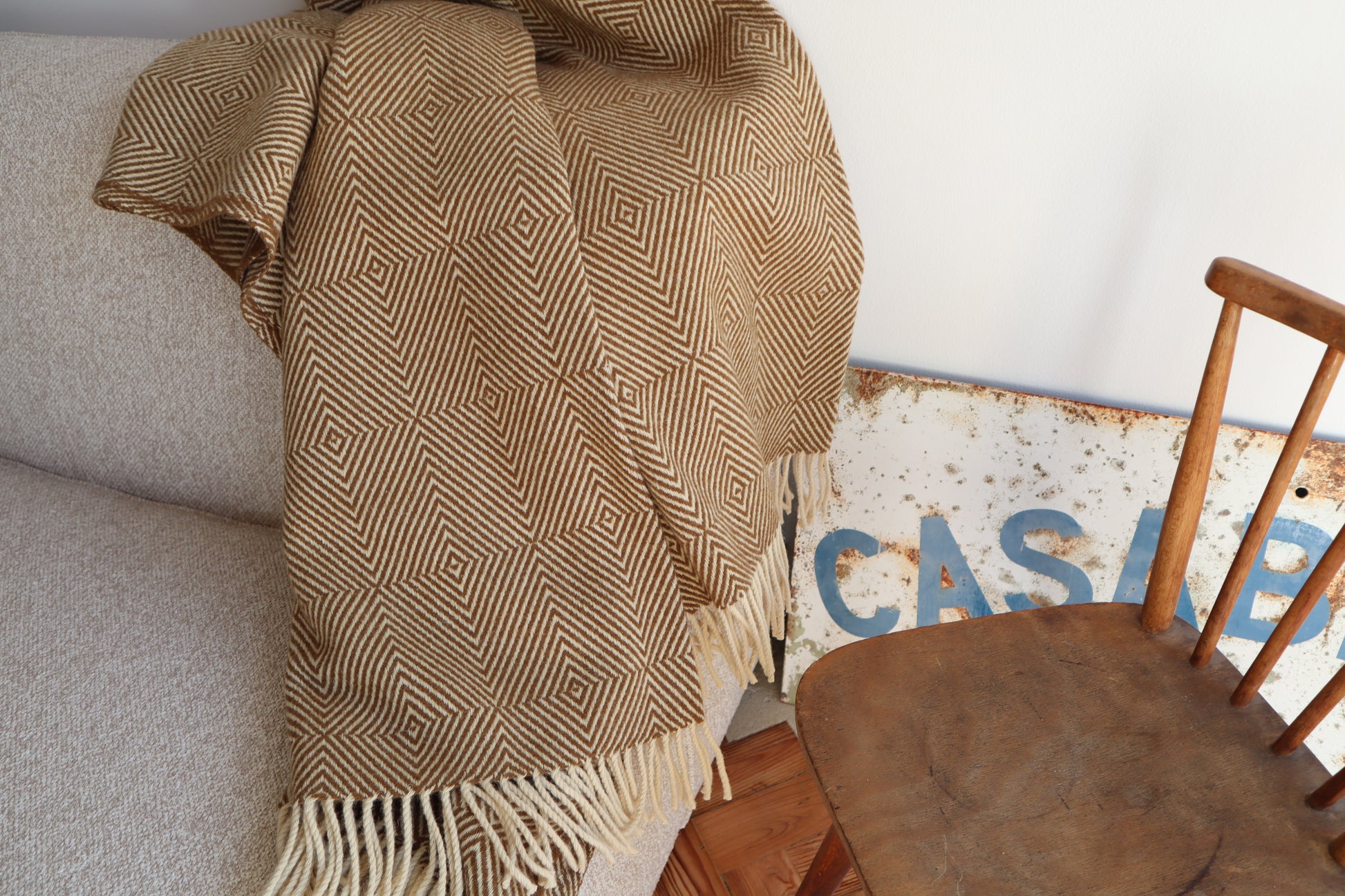 Made from 100% pure sheep's wool and featuring a distinctive diamond pattern in light blue and cream tones, the Ecolã blanket offers high-quality and durable craftsmanship based on over 100 years of Portuguese craftsmanship tradition.